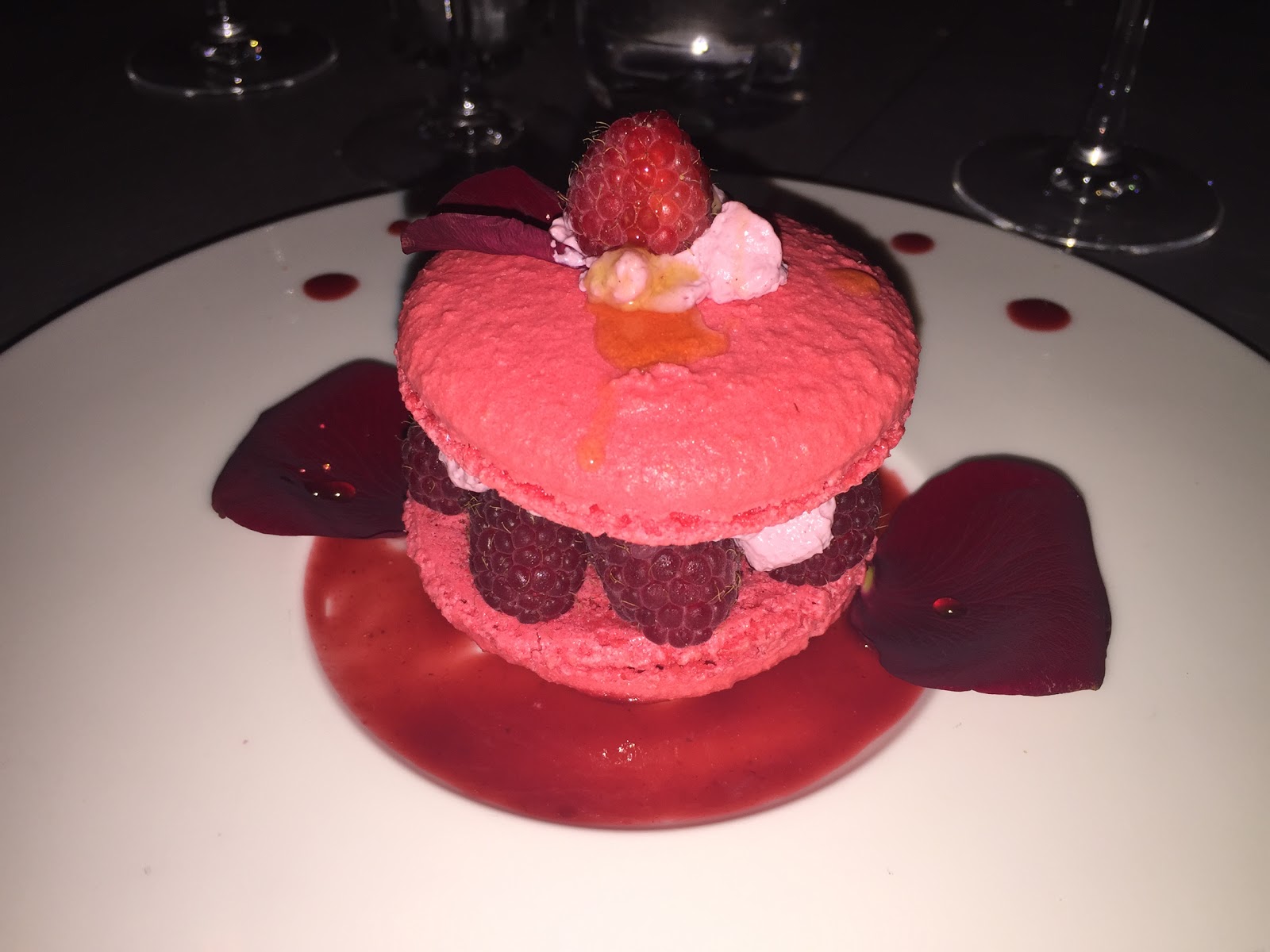 Après ce plat, je ne vous cache pas que j etais rassasiée mais ayant vu le macaron aux framboises sur une table voisine et étant un de mes péchés mignons, il fallait absolument que je le test ; Verdict une tuerie, on sentait parfaitement la poudre d amande, la ganache légère il etait parfaitement craquant.