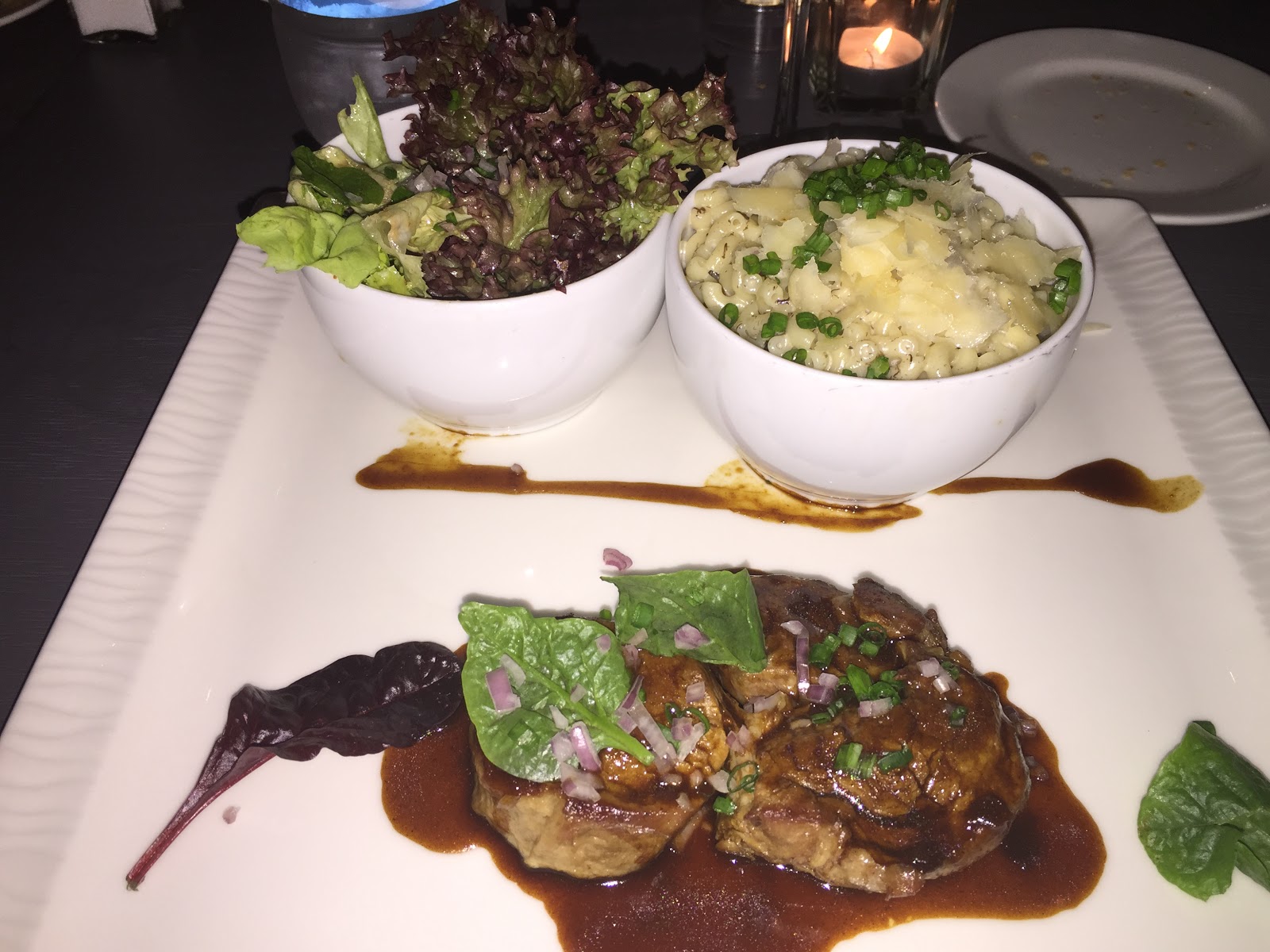 En plat, l entrecôte de veau avec son risotto de coquillette, au debut je m attendais à du riz à la vue des coquillettes j etais un peu déçu me disant « ohh des pâtes pfff » mais comme on dit il y a pâtes et PATES » elles etaient délicieuses, chaudes, crémeuses parfaitement assaisonnées avec des copeaux de parmesan, je me suis REGALEE, la viande était tout aussi délicieuse cuite à point.