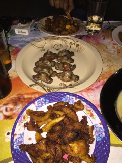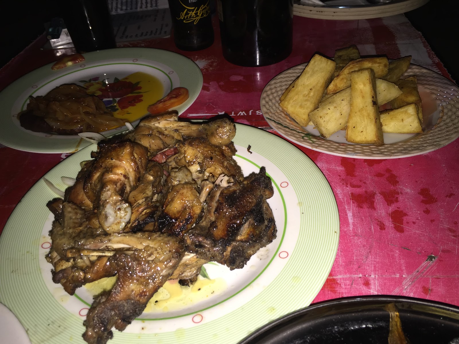 Nous avons pris un petit mix afin de goûter un peu à tout: poulet braisé, sole braisé, brochette de gésier, merguez, aloco, igname, attieke.