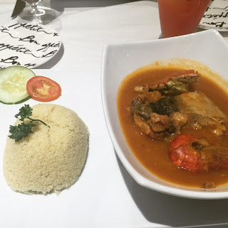 Comme je le disais précedement la spécialité de chez Marcène est la cuisine africaine, un large choix de mets africains nous sont donc proposés. J avais envie de changer un peu , cette fois-ci pas de viande pour moi mais plutôt le filet du pêcheur, qui s’avère être une soupe du pêcheur( composée de crabe, machoiron, gambas) accompagnée d’attieké; La sauce était bonne et bien relevée.