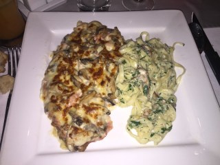 En plat, j ai choisi l escalope milanaise gratiné de fromage, au jambon et champignon accompagné de tagliatelle. Ce plat était délicieux et copieux, petit bémol au niveau des pâtes il y a avait trop de persil, mis à part ça c etait très bon.