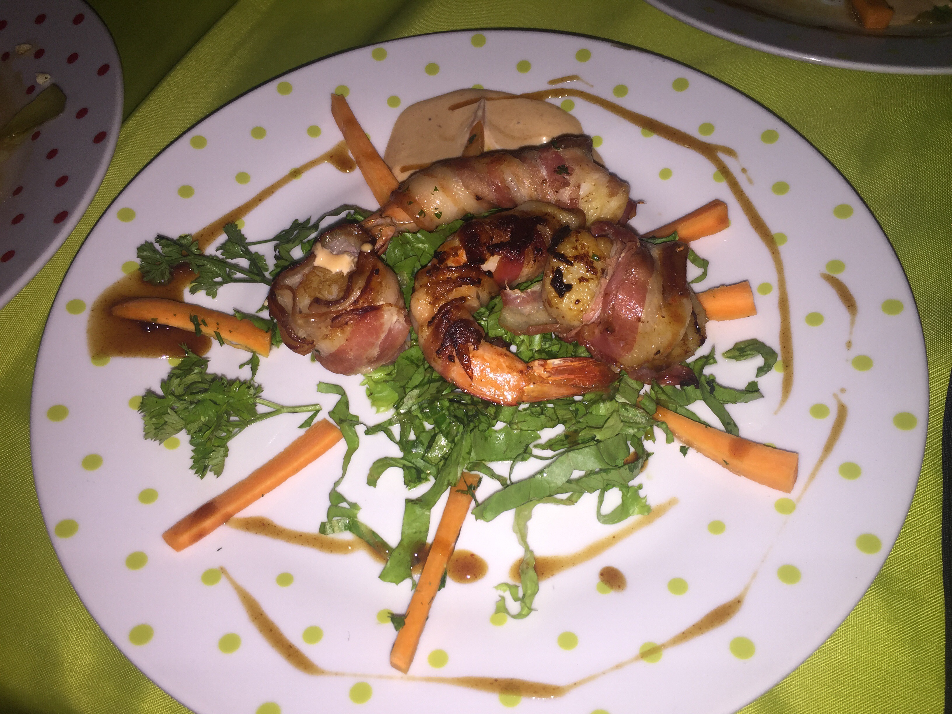 Le soir le chef nous a concocté en entrée, du tartare de thon, des gambas au lard et des noix de st jacques au lard.
