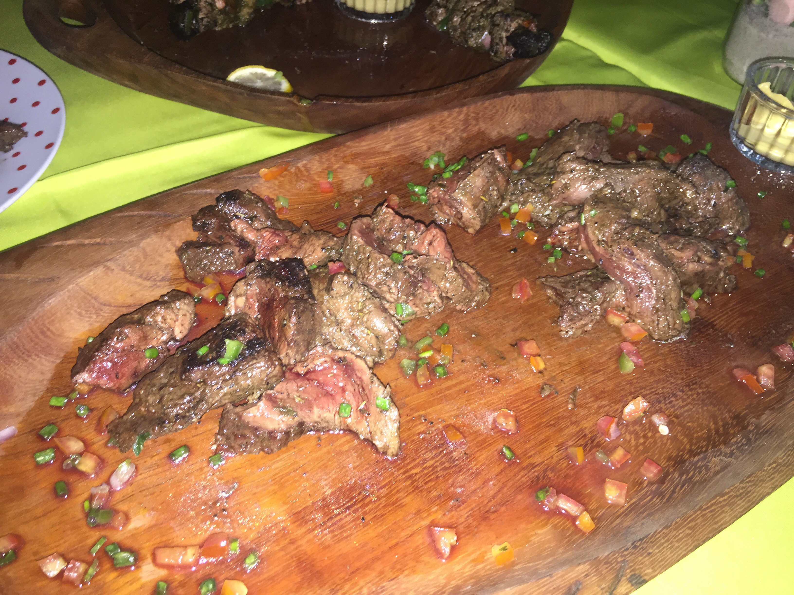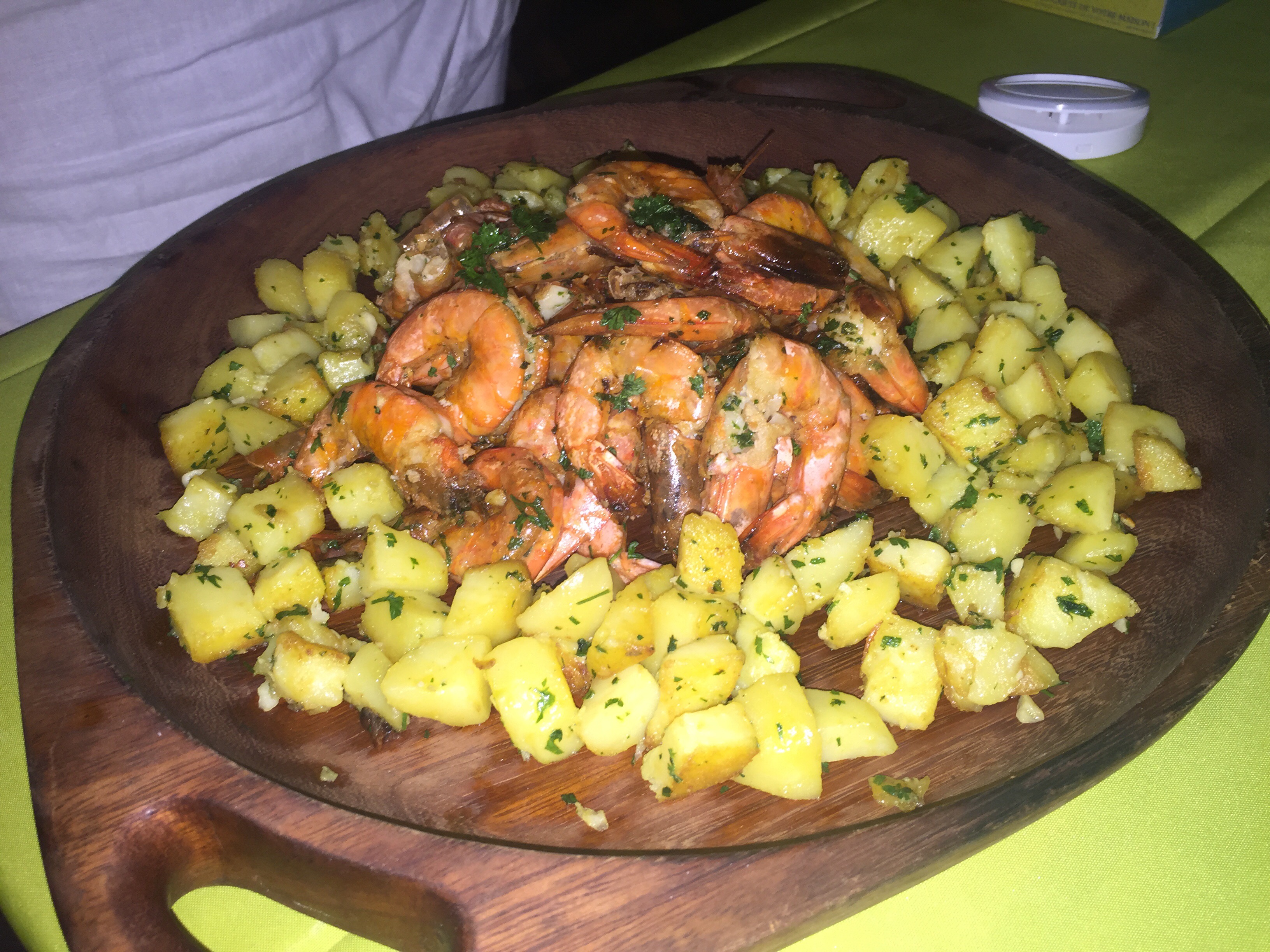 En plat: des gambas sautées, des brochettes de boeuf, du filet mignon accompagnés de légumes, pomme de terre et le riz spécial romano.
