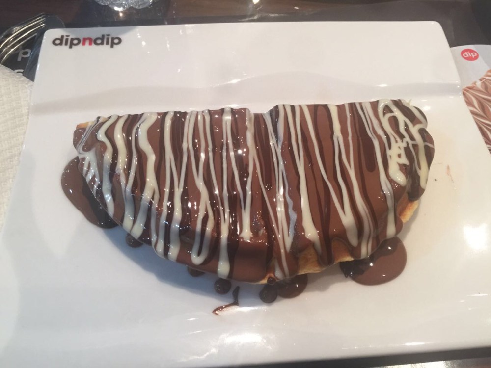 En général, je ne suis pas vraiment fan de chocolat au lait car je trouve le dosage cacao et lait souvent mal dosé laissant un goût lourd en bouche, je préfère mon bon vieux chocolat noir qui au pire est trop amer( ce qui me gêne moins qu’un chocolat au lait raté) et là malheur pour moi dans le mélange trois chocolats de la spéciale Dip, le goût prédominant est le chocolat au lait et exactement celui que je ne supporte pas… Je n’ai donc pas pu savourer parfaitement ma gauffre qui était par contre plutôt bonne…Tout ce chocolat à un peu gâché le tout.