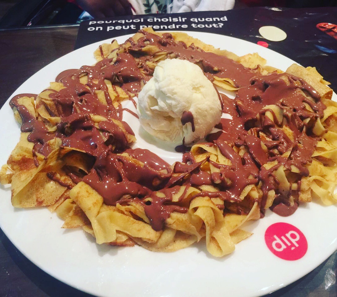 J’ai ainsi testé la gauffre spéciale dip aux 3 chocolats et mon amie l’assiette de tagliatelle de crêpes avec sa boule de glace ( j’ai oublié le nom exact).