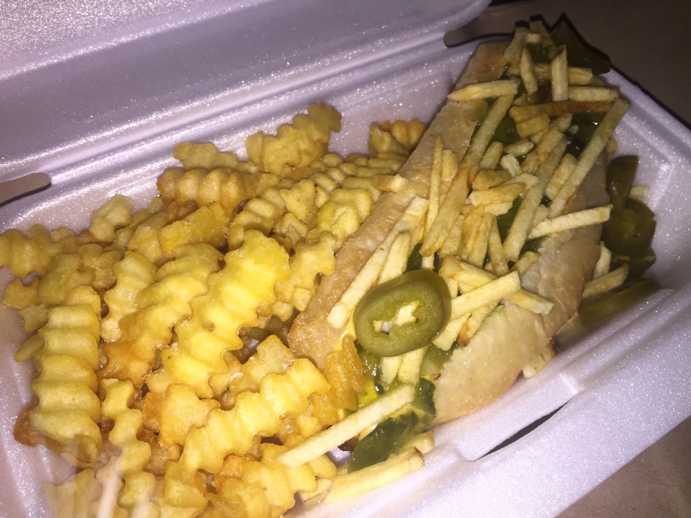 j’ai donc choisis le relish qui est un hotdog à base de sauce gravy et de jalapenos(piment) agrémenté de fritelles.