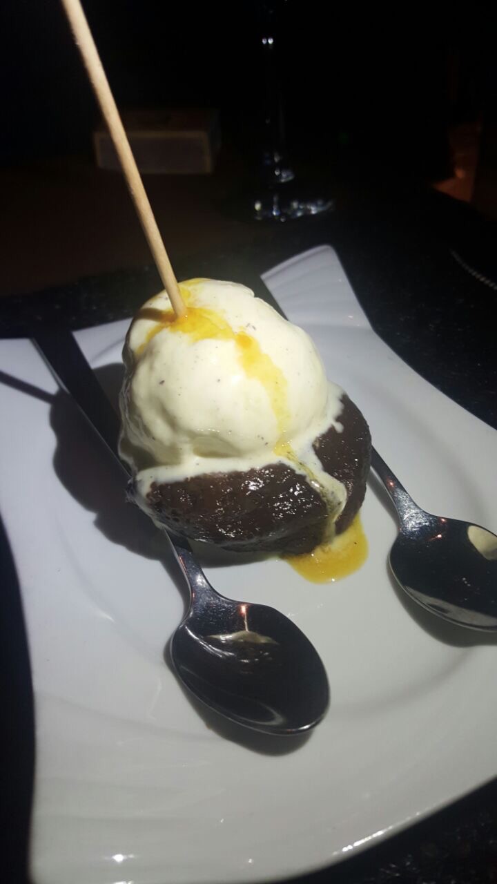 Nous avons pris des cocktails et un moelleux au chocolat pour les accompagner; le moelleux était bien présenté et plutôt bons, il était agrémenté d’un zeste d’orange qui relevait le goût du chocolat.