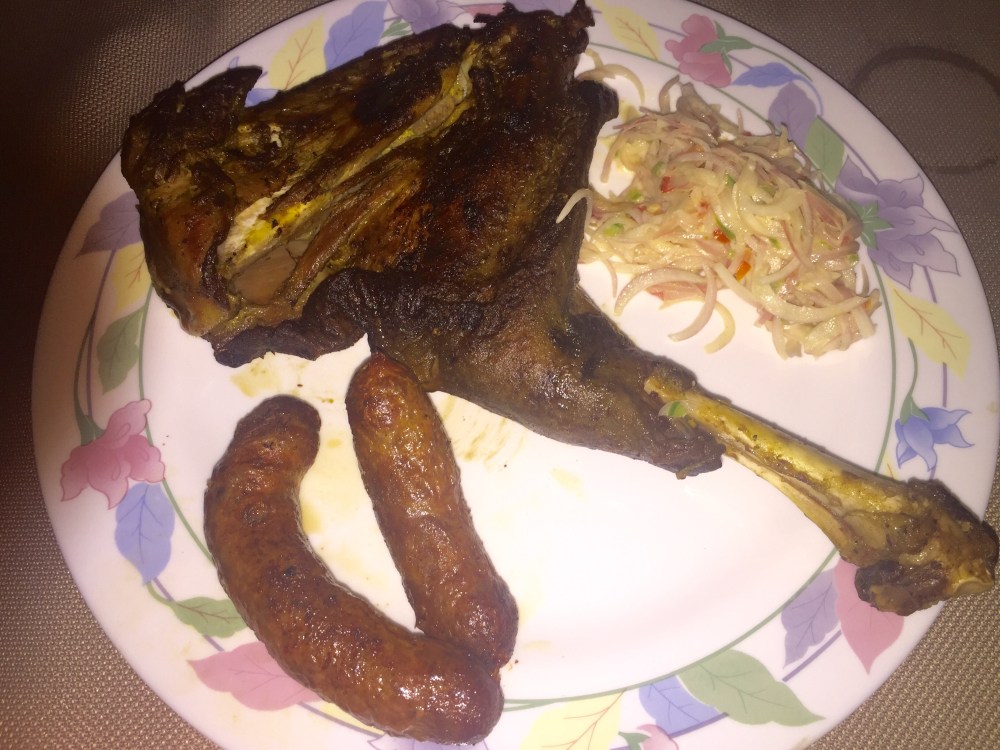 On a donc pris un gigot avec deux saucisses à emporter, les saucisses étaient vraiment bofs par contre le gigot était plutôt bon, la viande est un peu forte en goût comparé à un gigot d’agneau mais aussi tendre mais je n’ai vraiment pas pu le savourer pleinement n’arretant pas de me dire » tu es entrain de manger un cabri Meuf!!! »