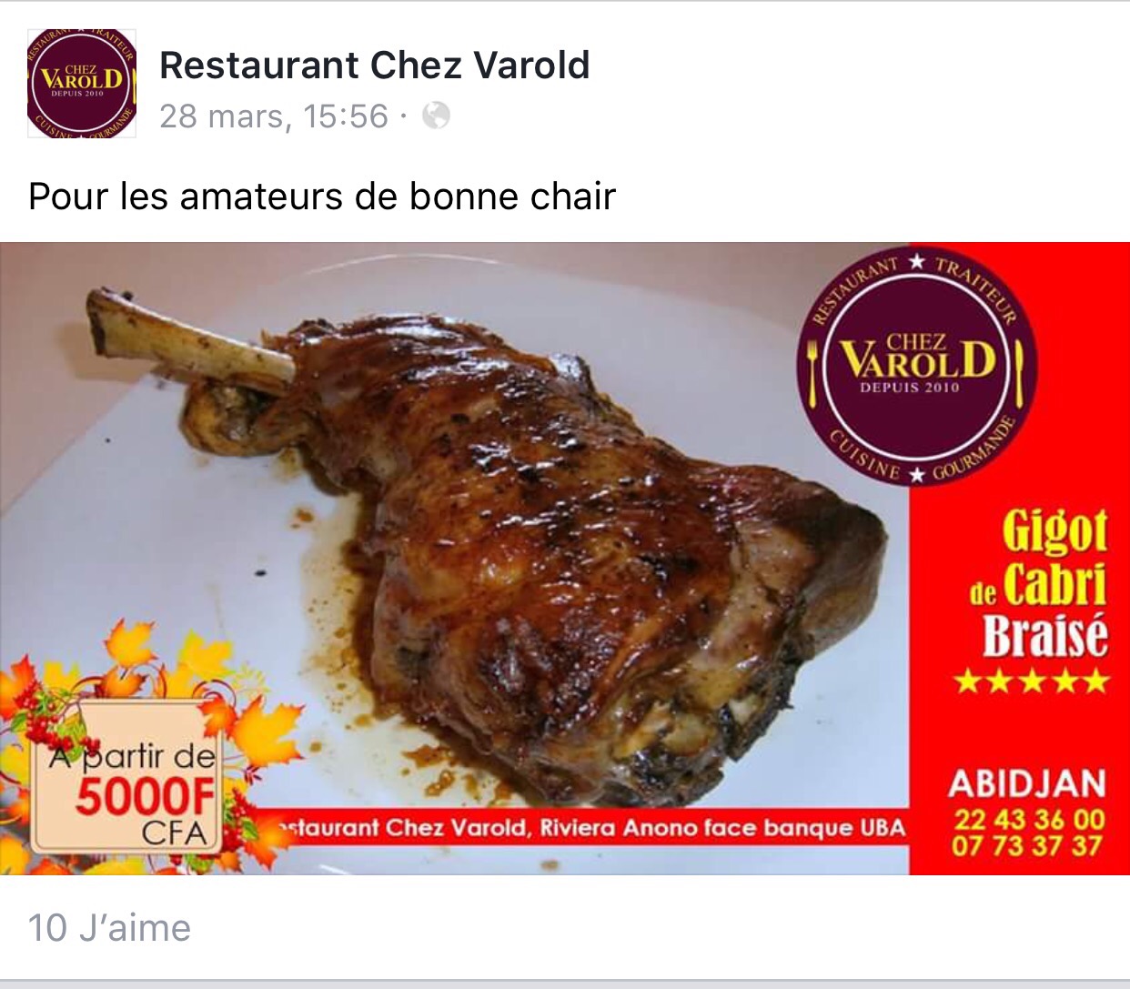 Nouvelle découverte faites sur facebook, chez Valrold propose des gigots de cabri braisé( oui vous avez bien lu du cabri!!Je ne suis pas trop fan de Cabri, juste parce que je visualise l’animal et ça ne m’a jamais traversé l’esprit de vouloir en manger; Mais un soir une amie qui a également vu le post facebook a voulu m’entrainer dans cette découverte et je me suis dis pourquoi pas mais avec beaucoup d’appréhension.