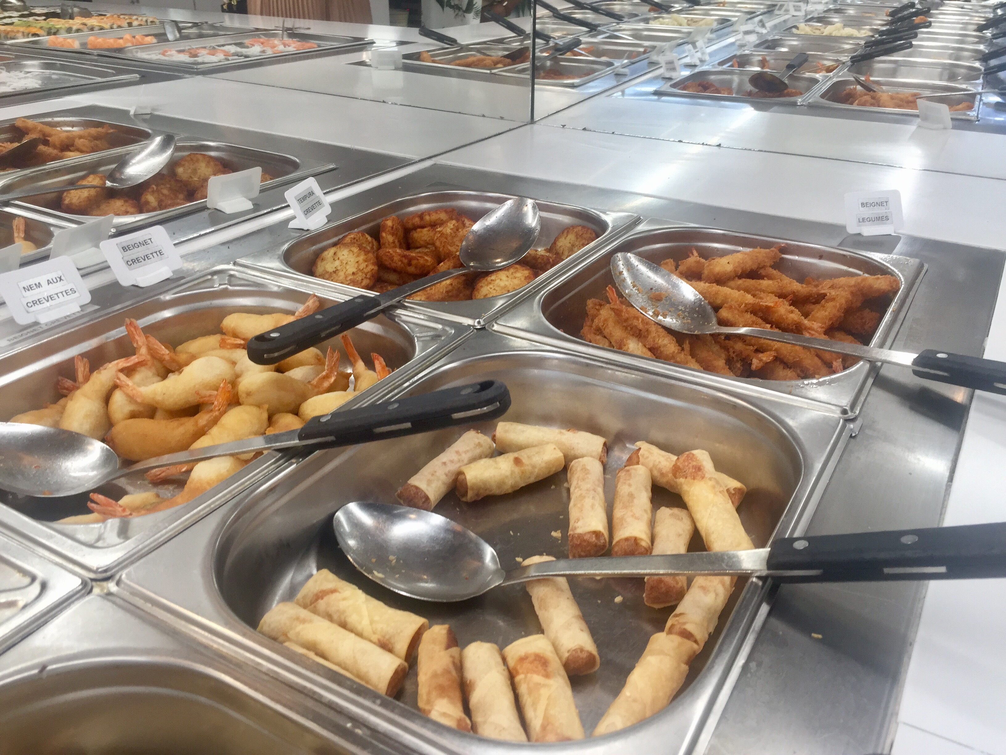 En effet, sont proposés, des raviolis vapeurs, nems, sushis , makis, des nouilles, riz cantonnais, boeufs aux oignons,poulet croustillant et j’en passe mais aussi des moules , escargot de bourgogne, gratin dauphinois.