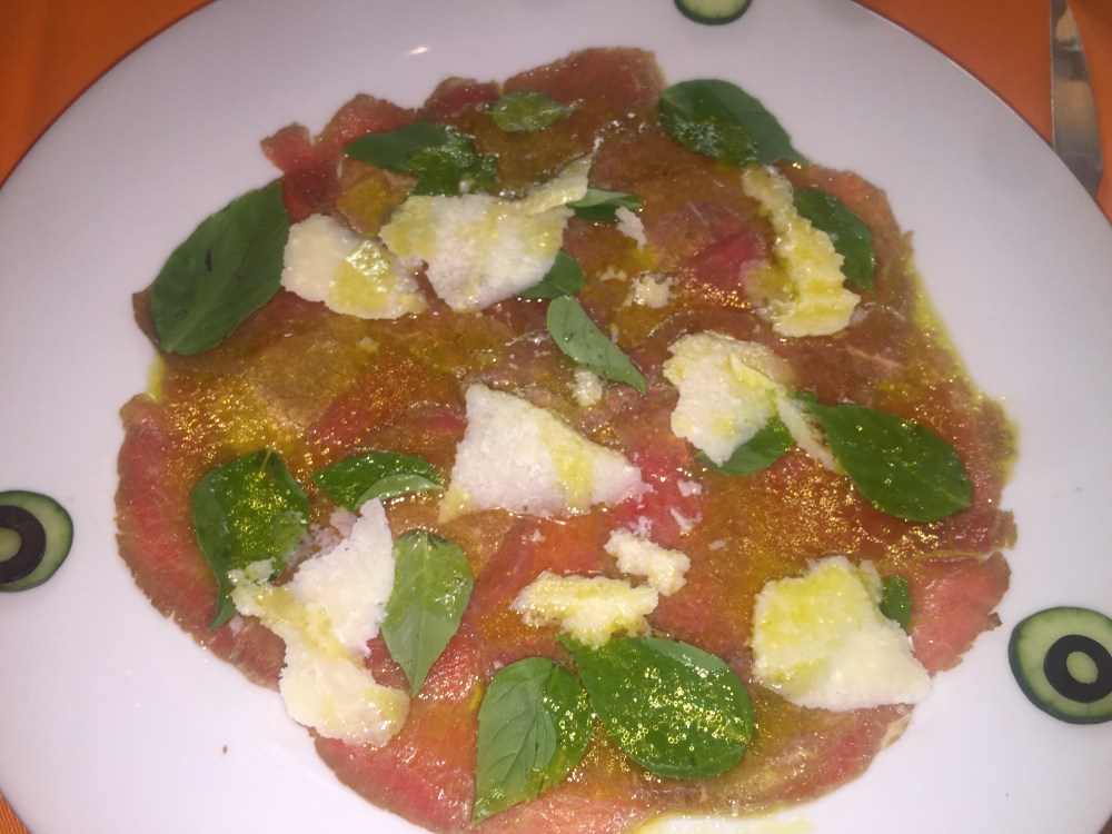 En Entrée, je suis allée sur une assiette de carpaccio de boeuf, qui était bonne mais il y avait un petit peu trop d’huile;