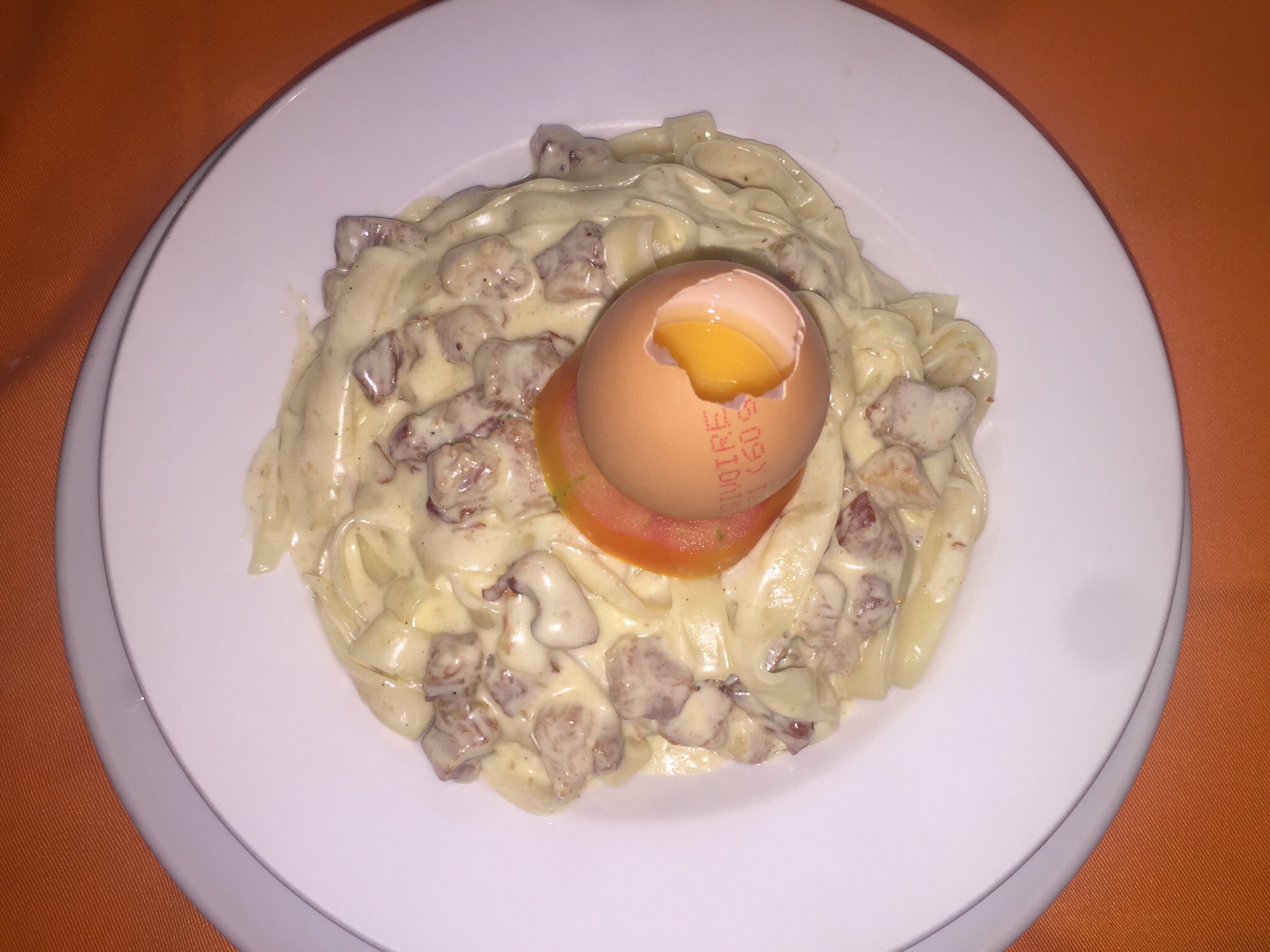 En plat, j’ai pris des pâtes à la carbonara, qui était bonne, la présentation était inattendue et m’a laissé perplexe, c est la première fois que je vois cette disposition de l’oeuf qui pour le coup marque les esprits…