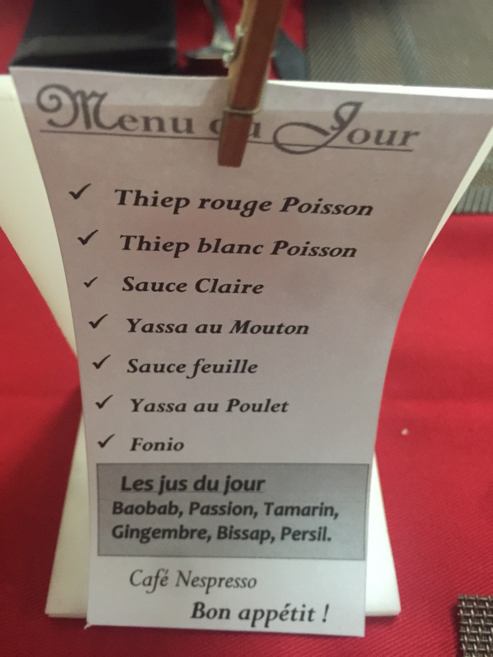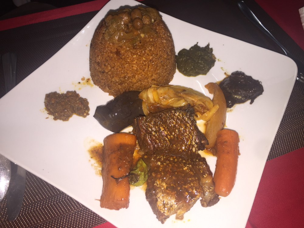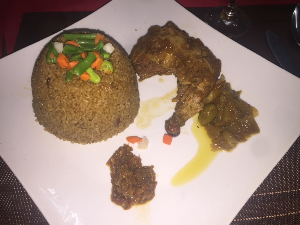 Je décide donc de tester le tchep blanc au poulet et mon ami le tchep rouge au poisson accompagné d’un jus de passion.