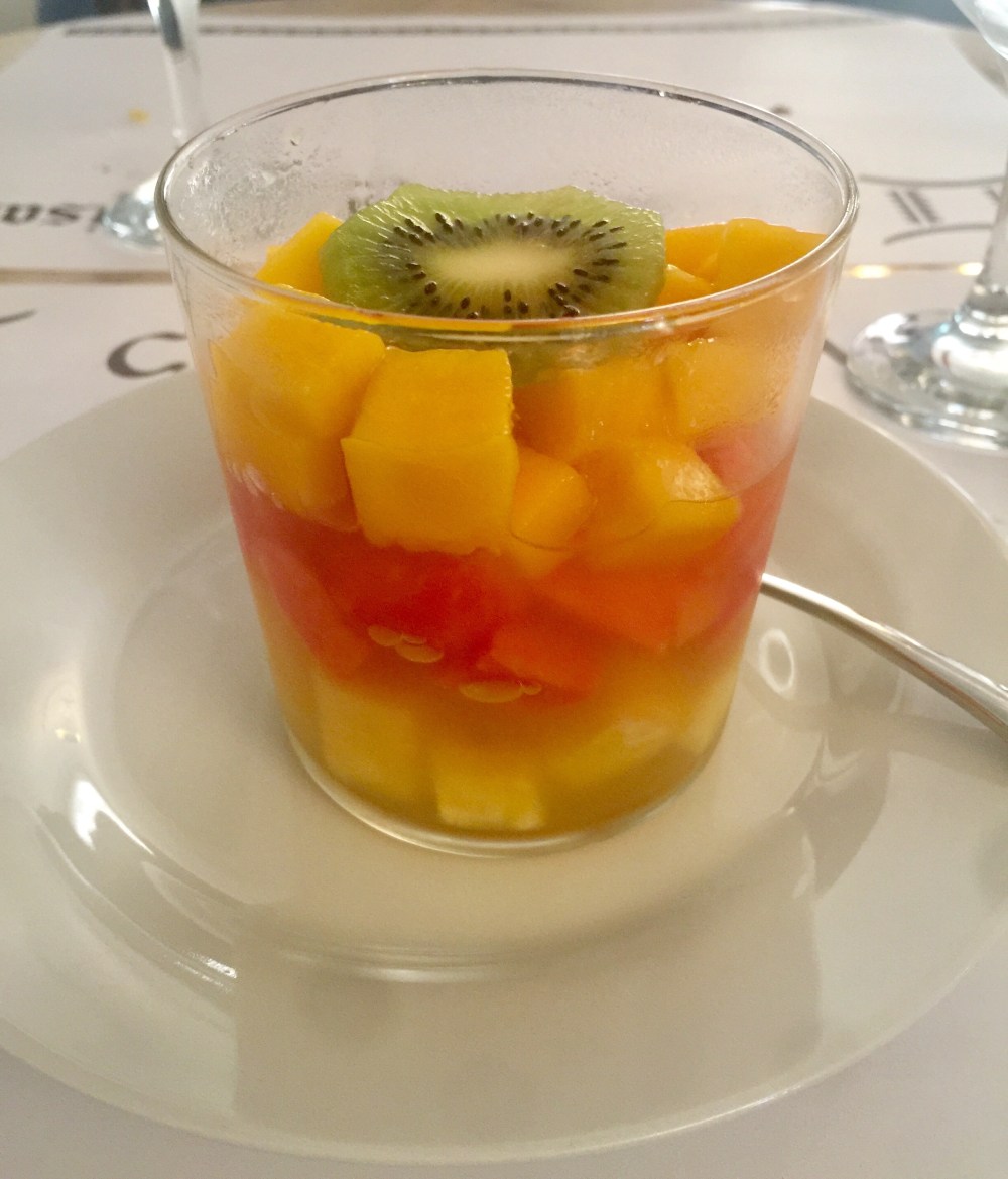 En dessert, je n’avais plus de place mais la vitrine de dessert me faisait de l’oeil donc je me suis laissée tenter par la salade de fruit.