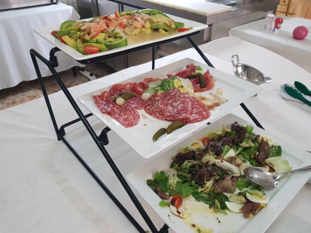 Côté plat, on a eu ce jour en entrée une salade à base d’avocat, de crevettes de crudités, charcuteries et gésiers.