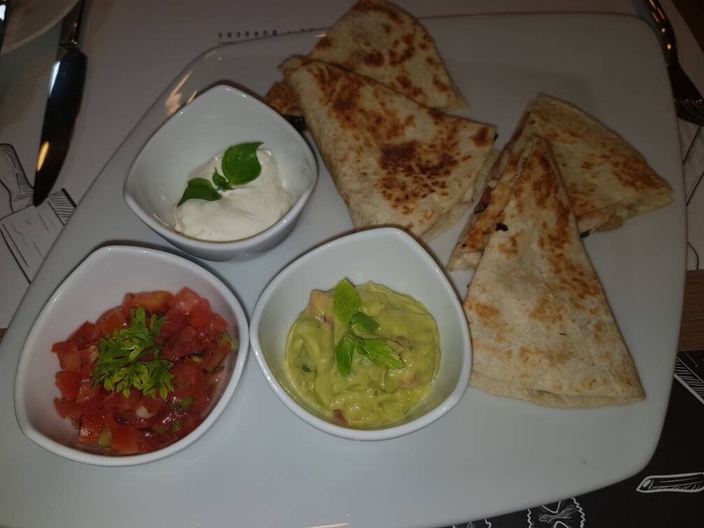 Côté Plat, j’ai pris en starter l’assiette de quesadillas, qui était vraiment bonne, le poulet était bien assaisonné et les petites sauces(guacamoles, yaourt et tomate) qui accompagnaient étaient également bonnes.