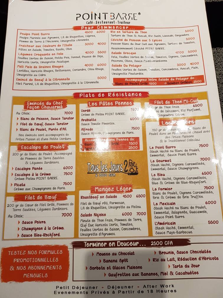 La carte est assez complète proposant des salades, des subs, des hamburgers et des plats du jour mixant cuisine européenne et épices d’ailleurs.