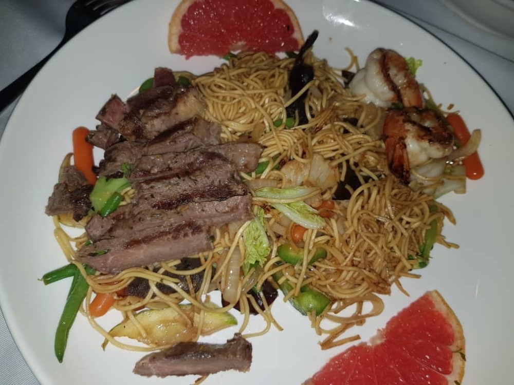 La carte comporte environ une dizaine de plats de specialités Asiatiques; Nous avons pris une salade avec des tranches de boeuf( style bo bun mais en version laitue) et une entrecôte avec des nouilles sautées et des gambas.