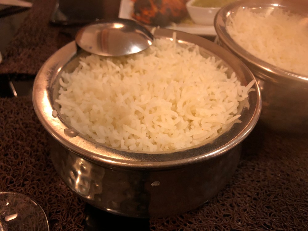 Le tout était accompagné par du riz blanc basmati, bien cuit, dont les grains étaient bien détachés et également des naans au fromage indien;