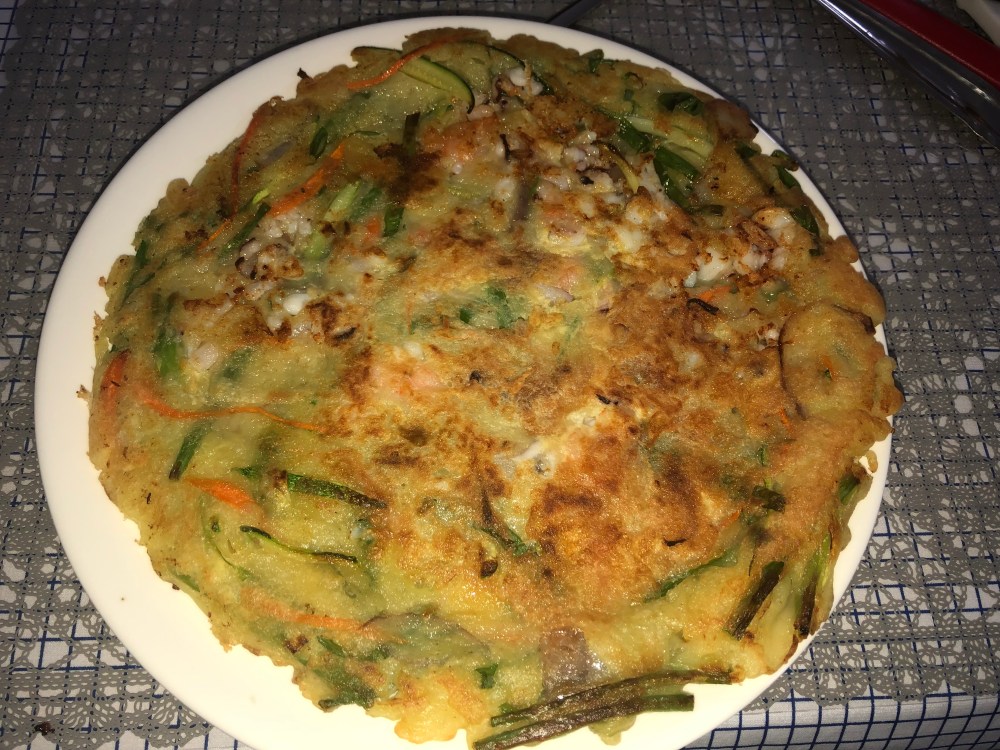 Qui est une galette coréenne à base de légumes et de calamars, un peu grasse mais super bonne.