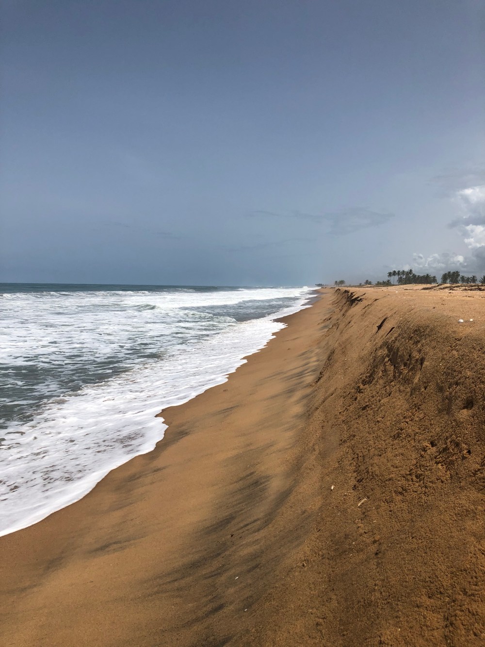 Pour info: La mer de Grand Lahou est agitée juste avant la saison de pluie mais plus calme le reste du temps, son sable est jaune orangé et sa boue ( mix d’eau de mer et de sable) excellente pour les gommages;