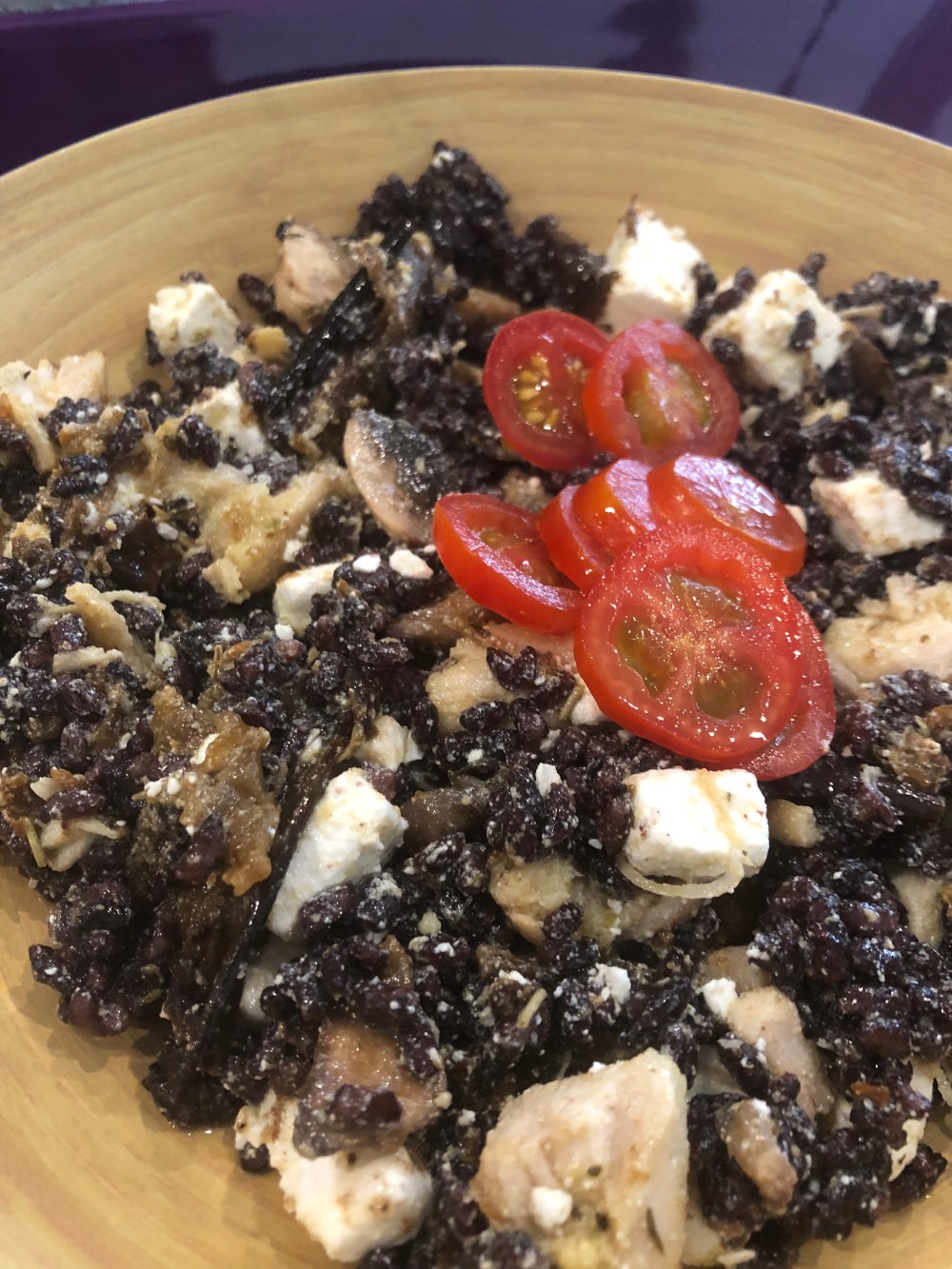Riz noir + poulet + Feta + aubergines marinées + oeuf à laquelle j’ai ajouté la sauce miel moutarde qui était bien trop riche pour le riz noir ( j’ai fait un mauvais choix :-()) mais les ingrédients étaient très bons.