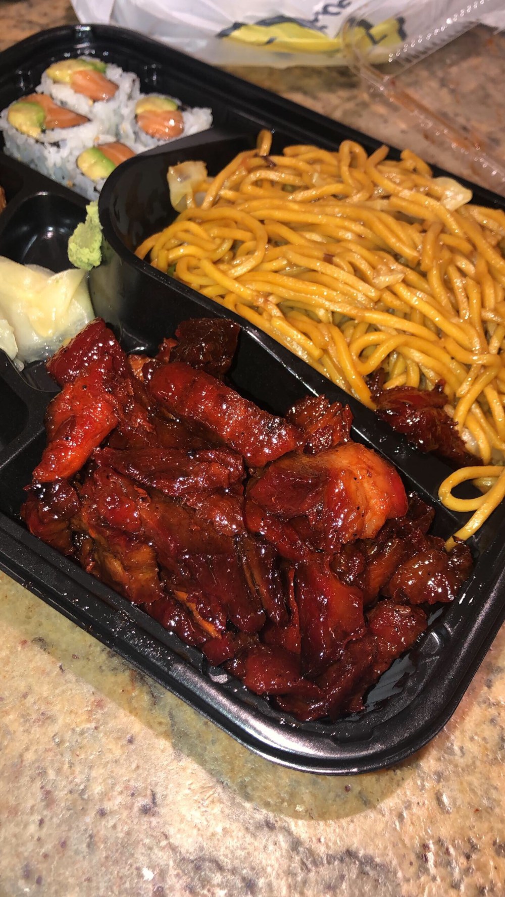 -Un Bento Coreen, plat très complet composé de maki, nouilles sautées avec des morceaux de porc sautés à la sauce sucrée.