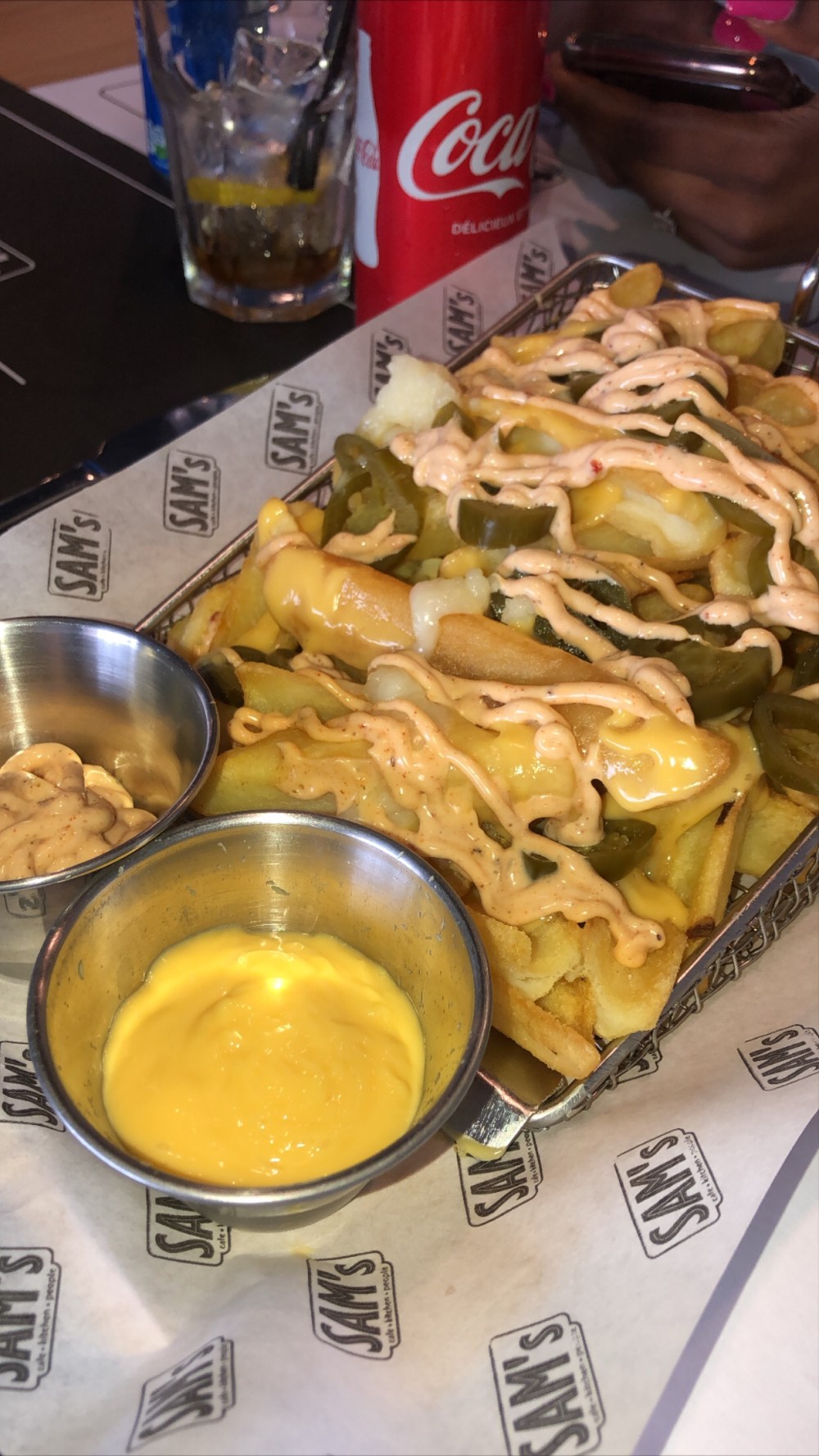 Il s’agit de frites recouvertes de jalapeños (piment mexicain) et cheddar, étant donné qu’elles sont passées au four, elles étaient plutôt molles mais très bonnes surtout avec les sauces qui accompagnaient.