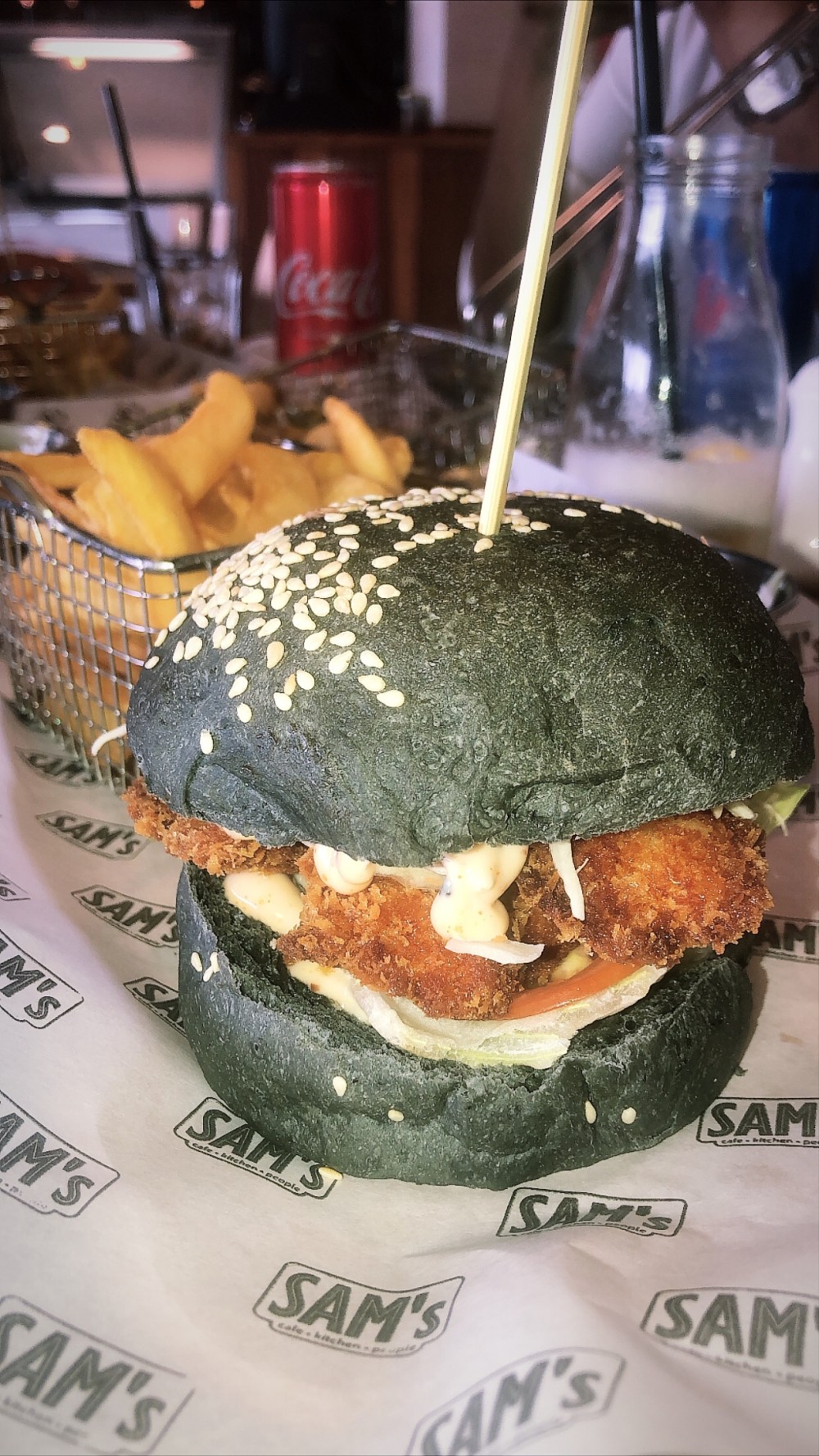 • Le burger aux gambas avec son bun noir qui était plutôt bon.