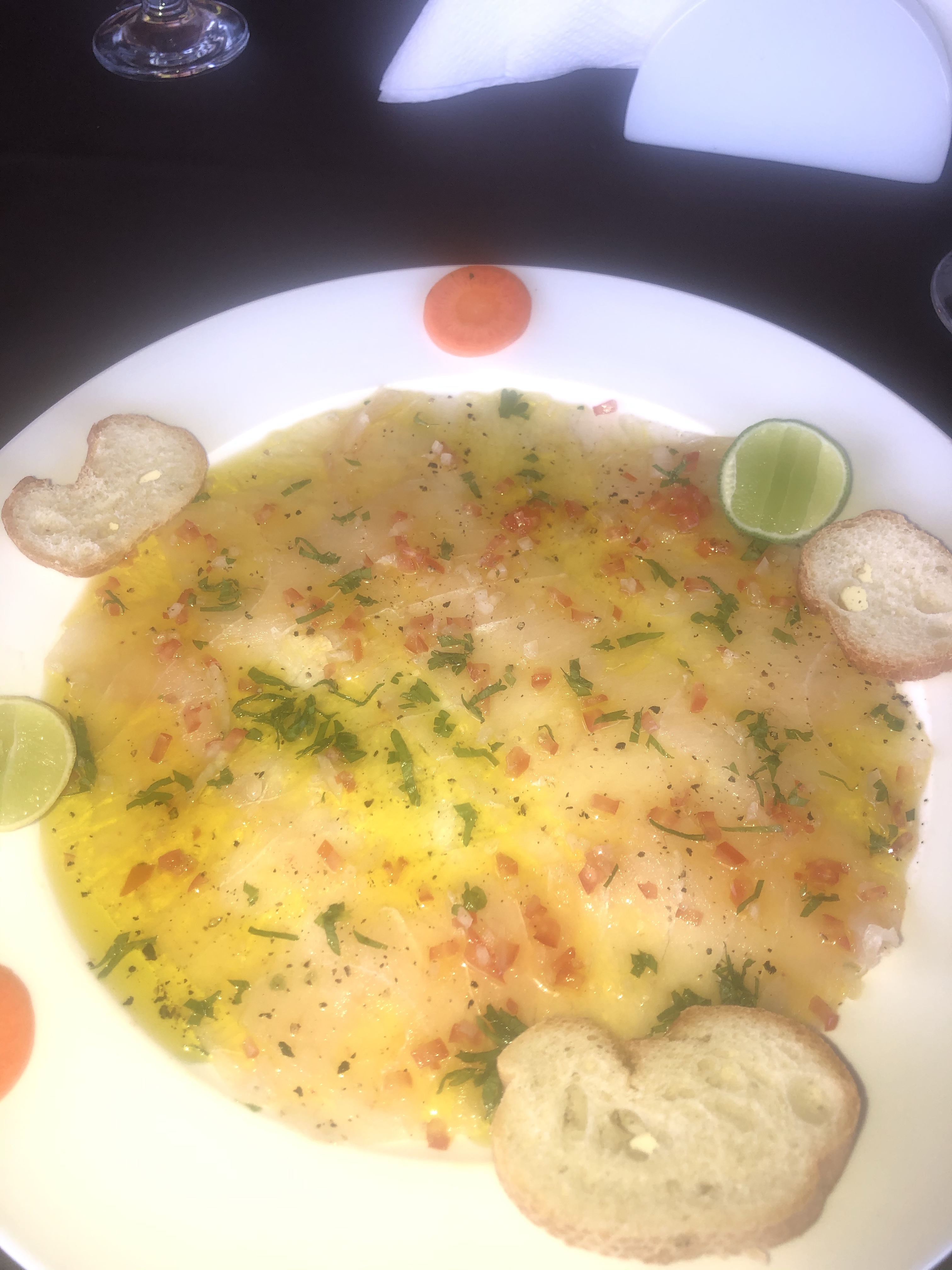 Côté carte, J’ai pris en entrée un carpaccio de poisson qui était très frais et très bien assaisonné.