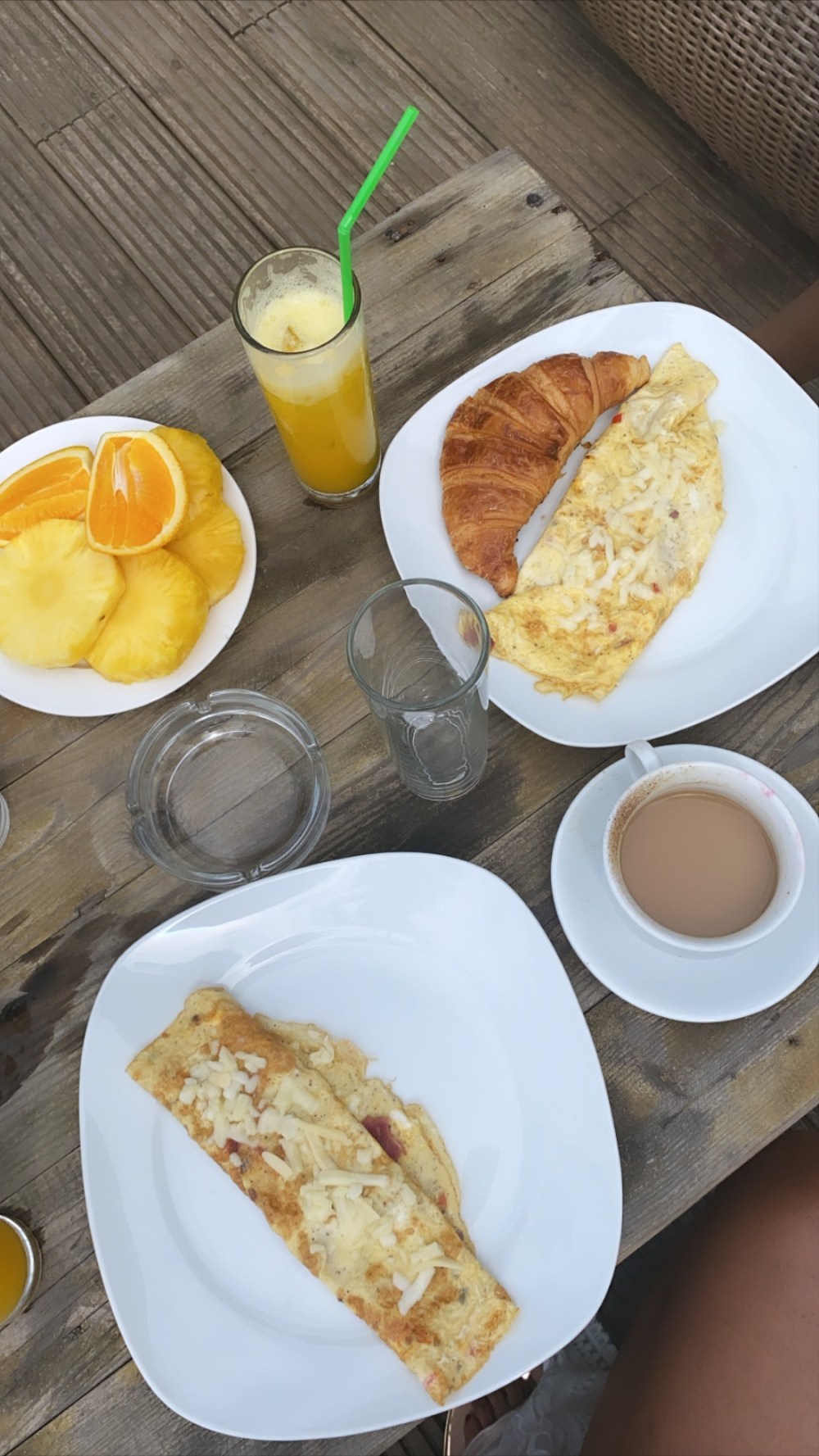 Nous avons eu droit à une belle omelette au jambon fromage, des fruits , un jus au choix ( je vous recommande celui à l’ananas qui est de loin le meilleur jus à l’ananas que j’ai pu boire de toute ma vie), des croissants ( vraiment bof pour le coup ne vous attendez pas à du grand luxe) et un manaïche,bof mais qui se laissait manger.