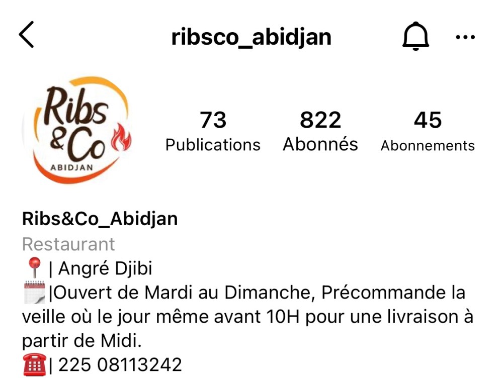 Il s agit de ribs& co situé à Angré, cette enseigne propose des bbq ribs, des jerk chicken ( spécialité jamaïcaine), des pulled pork burgers le tout à emporter ou à livrer à domicile