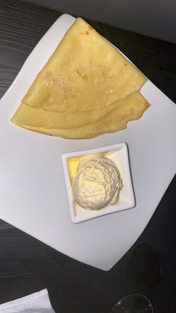 En dessert, j ai pris une crêpe simple accompagnée d une boule de glace vanille , elle avait l’air bien appétissante de visu mais malheureusement on sentait trop l’oeuf.