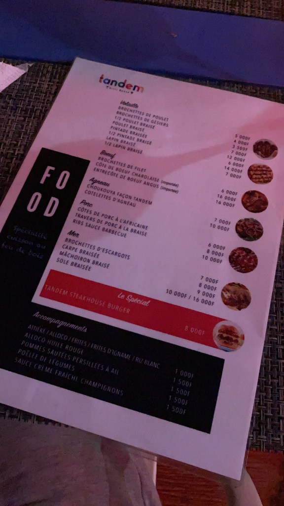 Situé à la 8 eme tranche sur le bd des Martyrs au carrefour les oscars, Tandem est un restaurant grill house qui propose toute sorte de viandes cuites au feu de bois.