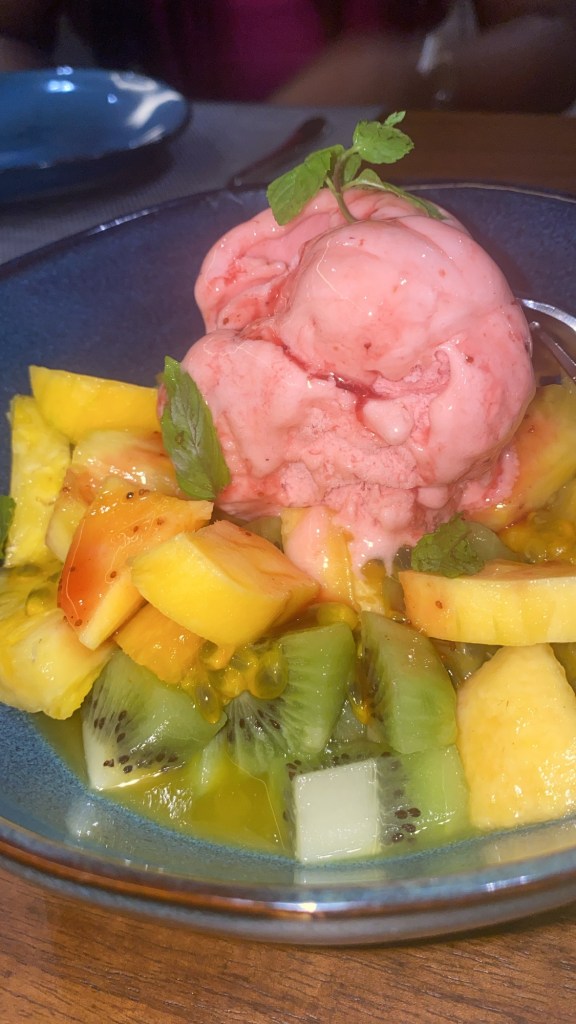 Le restaurant nous a offert 2 desserts, le mi cuit au chocolat et les sorbets aux fruits;