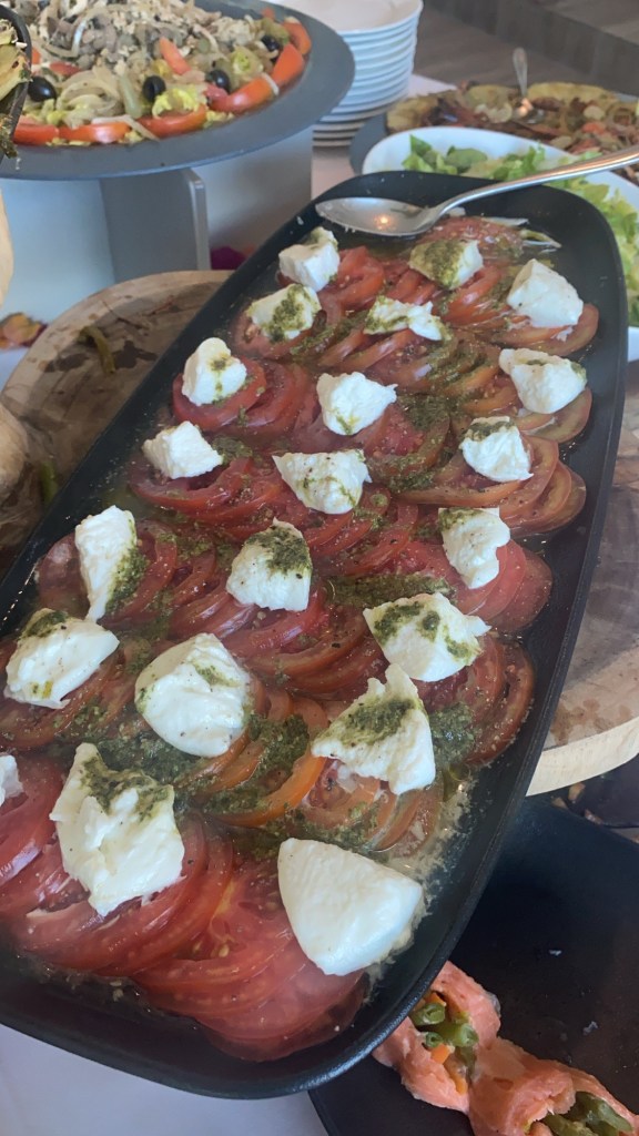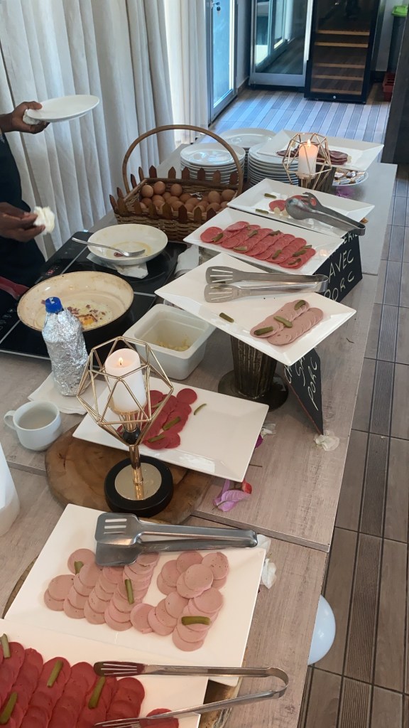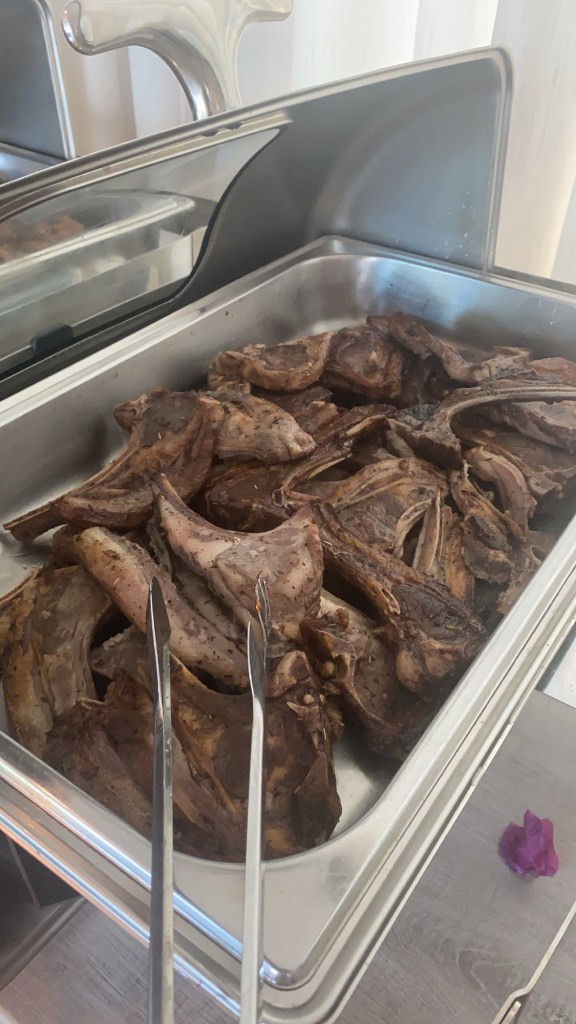 Le brunch se déroule à la salle de restauration près de la piscine, on y trouve des entrées froides et chaudes ( carpaccio, crudité, charcuterie,quiches etc…), des oeufs à la demande, des grillades ( poulets braisés, poissons piqués, langoustes…), des côtelettes d’agneau avec de l’alloco, frites, légumes, attieke.