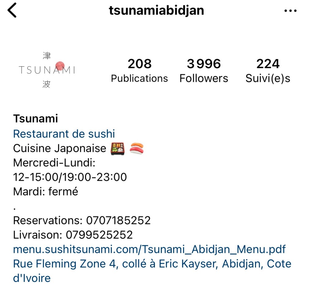 Petit dernier en terme de sushi à Abidjan, Tsunami est situé en Zone 4 juste à côté de la m Eric Kayser. L’établissement est sur 2 étages et propose une salle privative à l’étage.