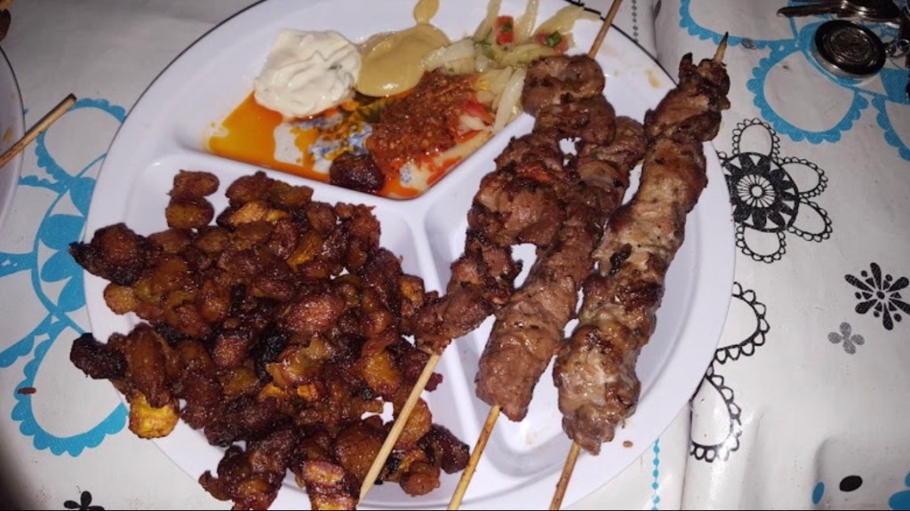 On peut y trouver des plats de grillades tel que des brochettes de viandes de boeuf, poulet braisé , gésiers…,si vous y allez testez les saucisses, j’ai particulièrement bien aimé ces dernières .
