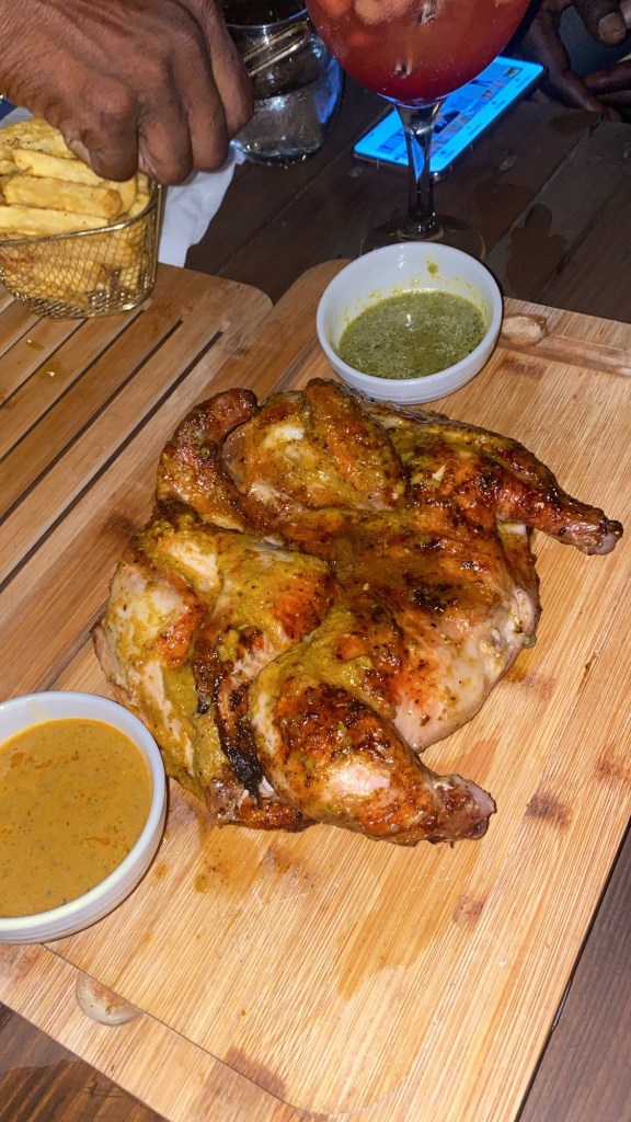Celui ci était vraiment tendre, mais je suis restée sur ma faim côté assaisonnement car ce dernier était plus en surface et pas bien intégré dans la chair du poulet. Côté présentation rien à dire ils ont écarté le poulet de la manière portugaise et la cuisson se fait à la braise.