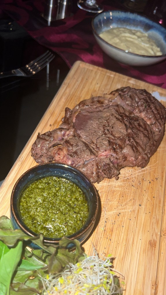 mes bémols sont : un peu trop de cartilage dans l’entrecôte hollandaise et la sauce chimichurri n’était pas top, un peu trop compacte à mon goût, je vous suggère d’aller sur une sauce poivre plutôt.