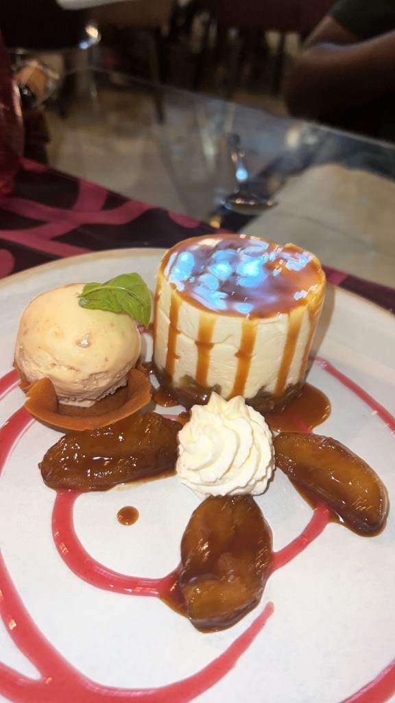 J’ai pris en dessert une sorte de cheese cake façon tatin qui n’était pas ouf, l’idée était néanmoins bonne avec les morceaux de pommes dans le cheesecake mais un peu trop d’information dans l’assiette; De plus, la texture du cheese cake n’etait pas terrible du coup je n’ai plus repris de dessert là bas.